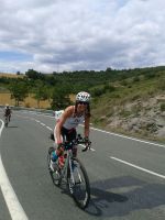 Mi velocidad media era bastante peor de lo que yo tenía previsto, pero son cosas que pueden pasar. Se hace lo que se puede y se mira para adelante. Lo importante era dosificar bien, que luego venía la gran carrera a pie. Pasaba por los pueblos, y era increible la animacion de la gente.AUPA NESKA!! por todas partes!! Me subo hacia la presa y me encuentro a Eider y a Mikel,.. qué emoción!! al rato, Jaime Gonzáles me adelanta y consigo seguirle un ratillo! Luego mis super pomponeros!! que alegríaaaaa. Luego Jaime M. Luarca, hecho todo un campeón me pega un doblete y me dice que regule con el viento…. Me daba la risa, porque cuando veía que mi media de watios bajaba y yo tratando de autoconvencerme de que es que regulaba fenomenal… Me reía sola.
