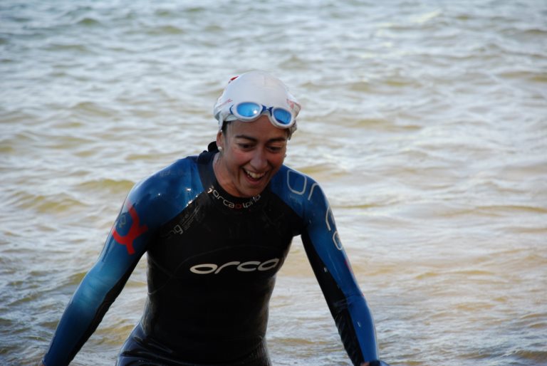 Tan sólo éramos 9 chicas en la salida. te evitas golpes, pero es más sencillo desorientarse y aprovecharse de unos buenos pies… Bocina de salida y a nadaaar! Todo fue con bastante normalidad… pocas pero algun golpe me llevé, nado a mi velocidad que no es nada del más allá pero veo que tengo varias compañeras que lo hacen «igual de bien» que yo… jejeje. Localicé varios «gorros blancos» y a seguirles… Todo bien, hasta que al final me desorienté bastante, y volvemos a lo de siempre… Le pregunto al hombre de la barca que para donde voy… Vamos, lo de siempre, que no hay manera deque consiga yo centrar bien yo esto. No veo nada! Pero como ya lo se, pues me daba la risa sola. Salí en 1h24´- Más de lo que esperaba, pero no di más importancia